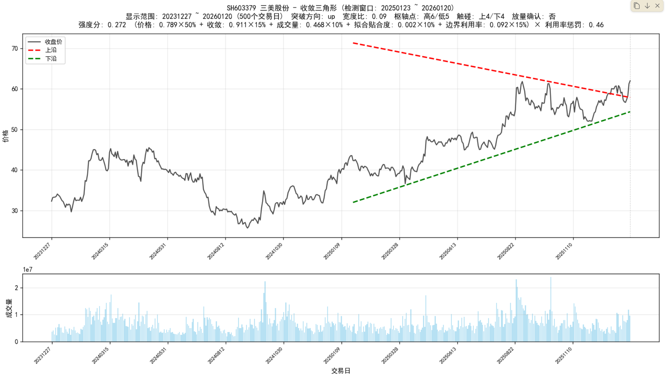 - Added support for daily best stocks reporting, including a new CSV output for daily best triangles based on strength. - Introduced a logging mechanism to capture detailed execution logs, improving traceability and debugging. - Implemented a v2 optimization for batch detection, significantly reducing detection time from 92 seconds to under 2 seconds. - Updated the .gitignore file to include new log files and outputs for better management. - Enhanced the pipeline script to allow for flexible configuration of detection parameters and improved user experience. Files modified: - scripts/run_converging_triangle.py: Added logging and v2 optimization. - scripts/pipeline_converging_triangle.py: Updated for new features and logging. - scripts/plot_converging_triangles.py: Adjusted for new plotting options. - New files: discuss/20260127-拟合线.md, discuss/20260128-拟合线.md, and several images for visual documentation.
