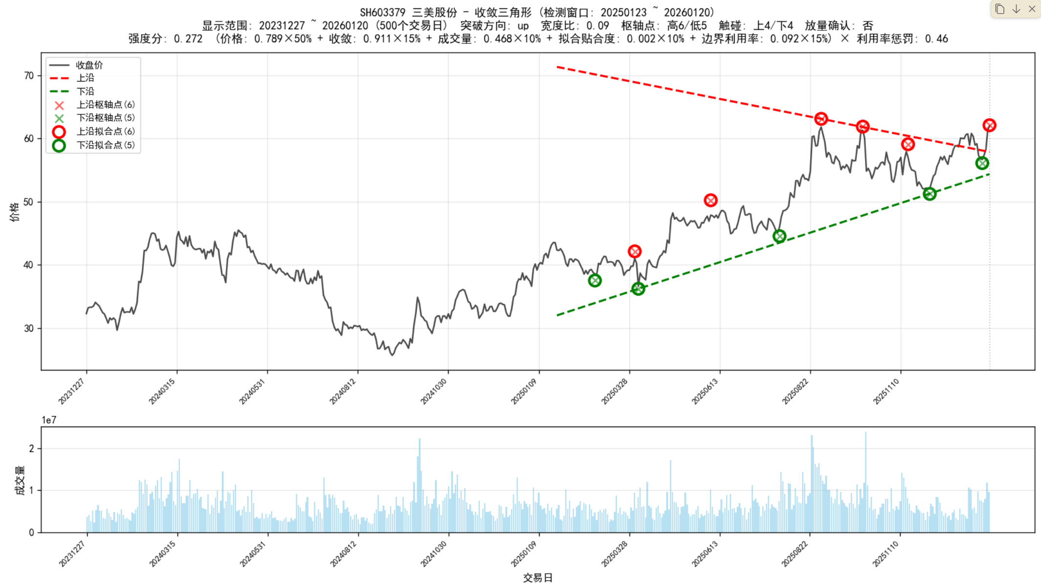 - Added support for daily best stocks reporting, including a new CSV output for daily best triangles based on strength. - Introduced a logging mechanism to capture detailed execution logs, improving traceability and debugging. - Implemented a v2 optimization for batch detection, significantly reducing detection time from 92 seconds to under 2 seconds. - Updated the .gitignore file to include new log files and outputs for better management. - Enhanced the pipeline script to allow for flexible configuration of detection parameters and improved user experience. Files modified: - scripts/run_converging_triangle.py: Added logging and v2 optimization. - scripts/pipeline_converging_triangle.py: Updated for new features and logging. - scripts/plot_converging_triangles.py: Adjusted for new plotting options. - New files: discuss/20260127-拟合线.md, discuss/20260128-拟合线.md, and several images for visual documentation.