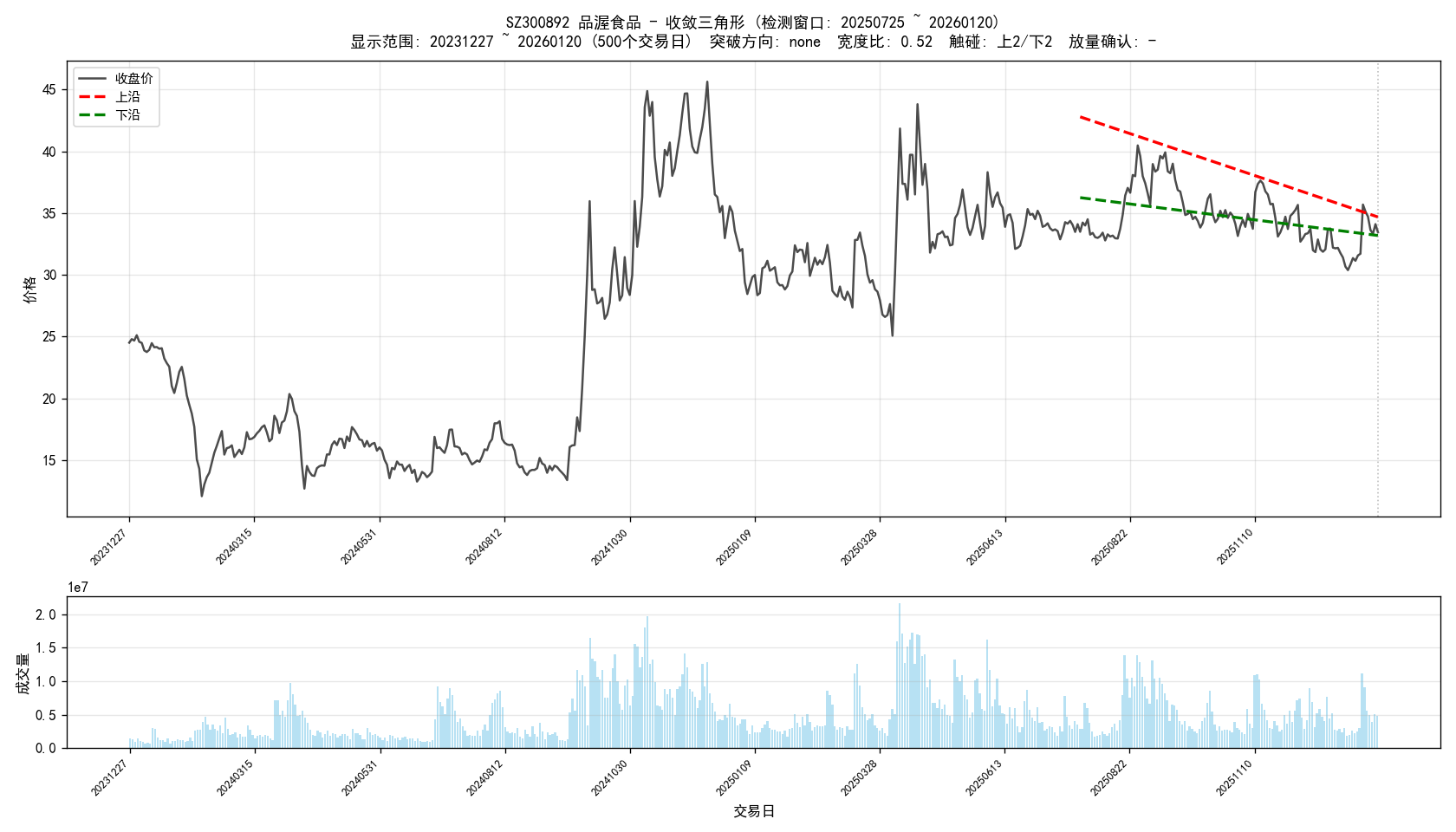 - Updated all_results.csv with additional stock data and breakout strength metrics. - Revised report.md to improve clarity and detail on stock selection criteria and results. - Expanded strong_breakout_down.csv and strong_breakout_up.csv with new entries reflecting recent analysis. - Introduced new chart images for selected stocks to visualize breakout patterns. - Added plot_converging_triangles.py script for generating visualizations of stocks meeting convergence criteria. - Enhanced report_converging_triangles.py to allow for date-specific reporting and improved output formatting. - Optimized run_converging_triangle.py for performance and added execution time logging.