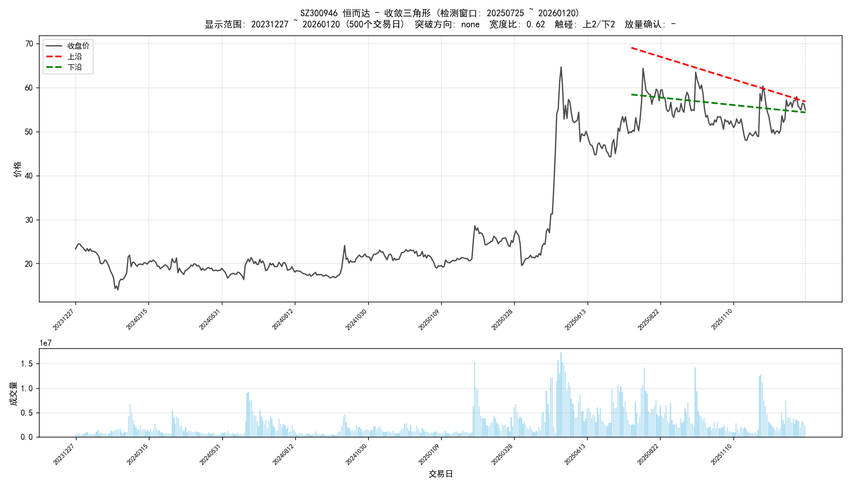 - Updated all_results.csv with additional stock data and breakout strength metrics. - Revised report.md to improve clarity and detail on stock selection criteria and results. - Expanded strong_breakout_down.csv and strong_breakout_up.csv with new entries reflecting recent analysis. - Introduced new chart images for selected stocks to visualize breakout patterns. - Added plot_converging_triangles.py script for generating visualizations of stocks meeting convergence criteria. - Enhanced report_converging_triangles.py to allow for date-specific reporting and improved output formatting. - Optimized run_converging_triangle.py for performance and added execution time logging.